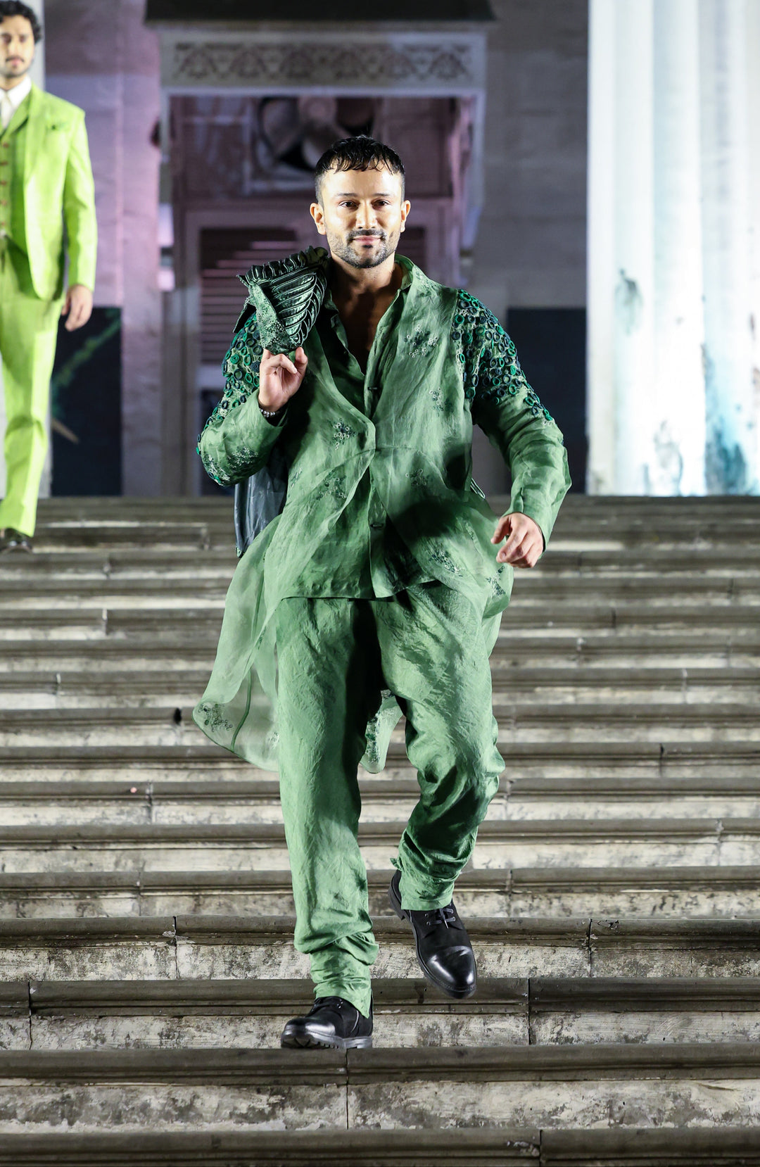 The colour palette moves through ivory, indigo, metallic silvers, mineral blues and deep greens, punctuated with gold accents, echoing both tradition and modernity. Inspired by India’s living crafts, the collection celebrates weaving, dyeing, and embroidery practices passed down through generations.