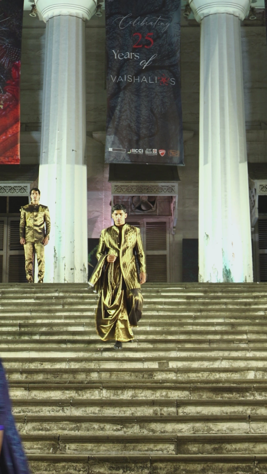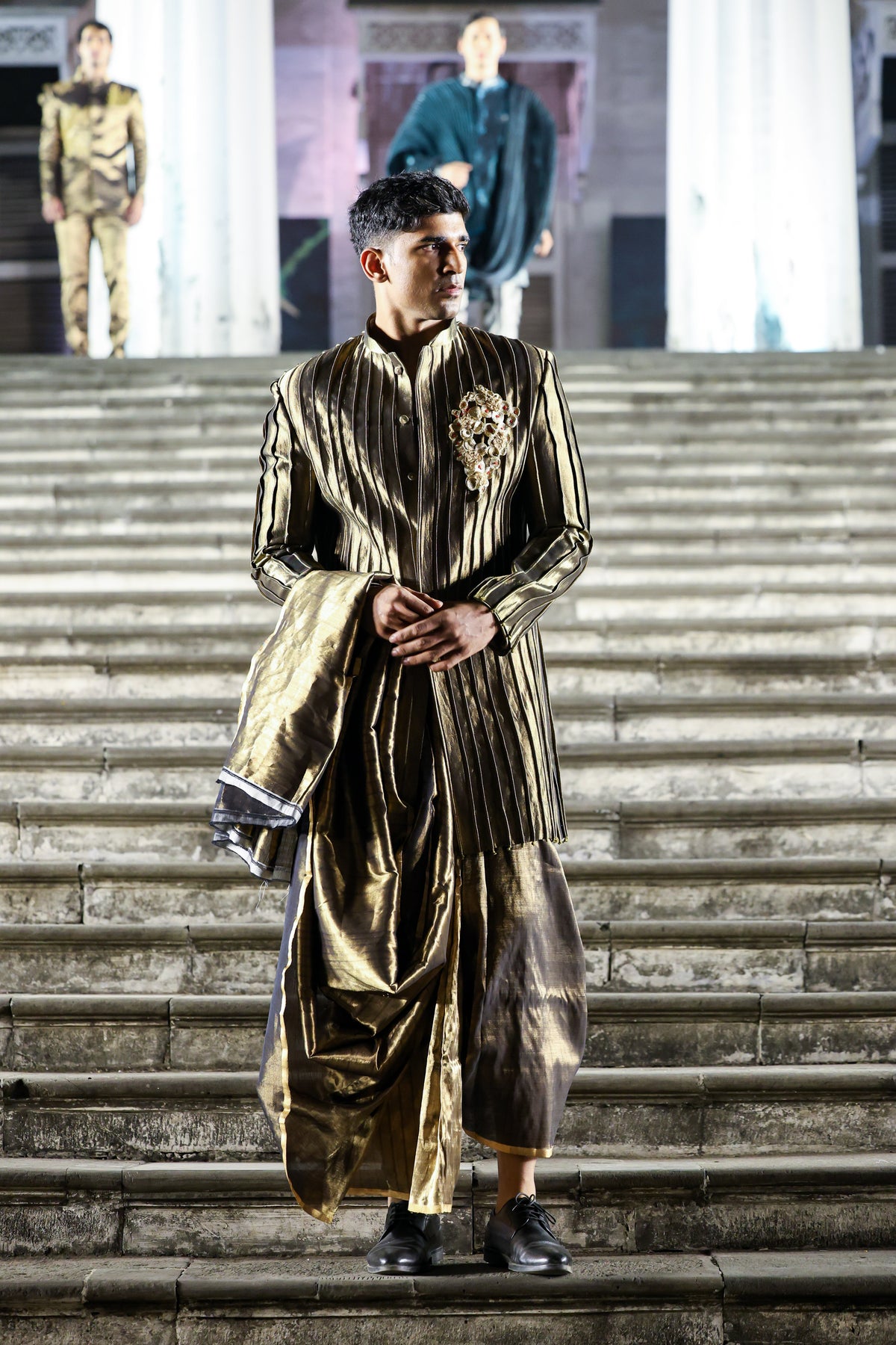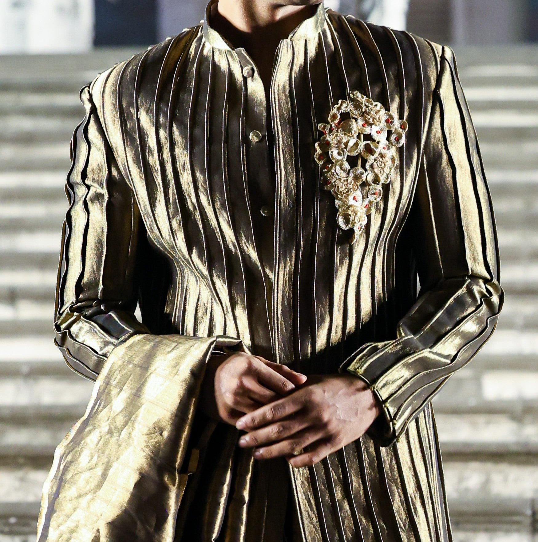 Paired with a gold draped dhoti, also rendered in maheshwari silk, the ensemble achieves tonal harmony and fluid balance. The dhoti’s soft metallic sheen and graceful drape complement the sculptural intensity of the sherwani, allowing texture and movement to coexist with ceremonial ease.