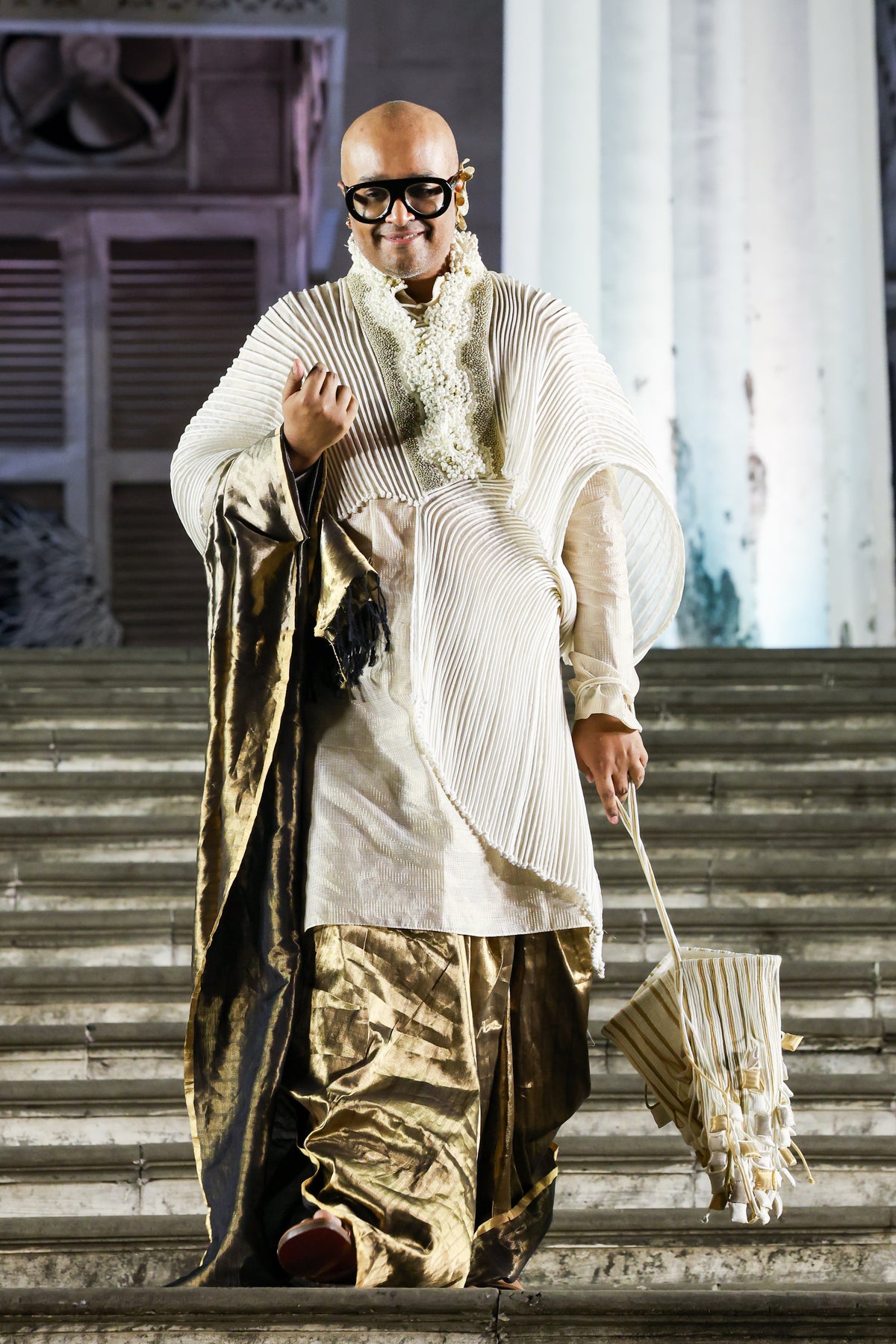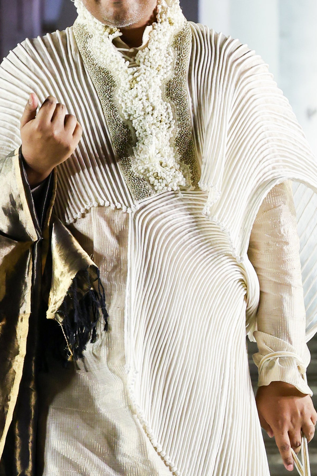 The look is completed with a gold metallic silk draped dhoti crafted in Maheshwari silk. Its luminous sheen and graceful fall offer a striking contrast to the textured kurta, balancing softness with ceremonial opulence.
