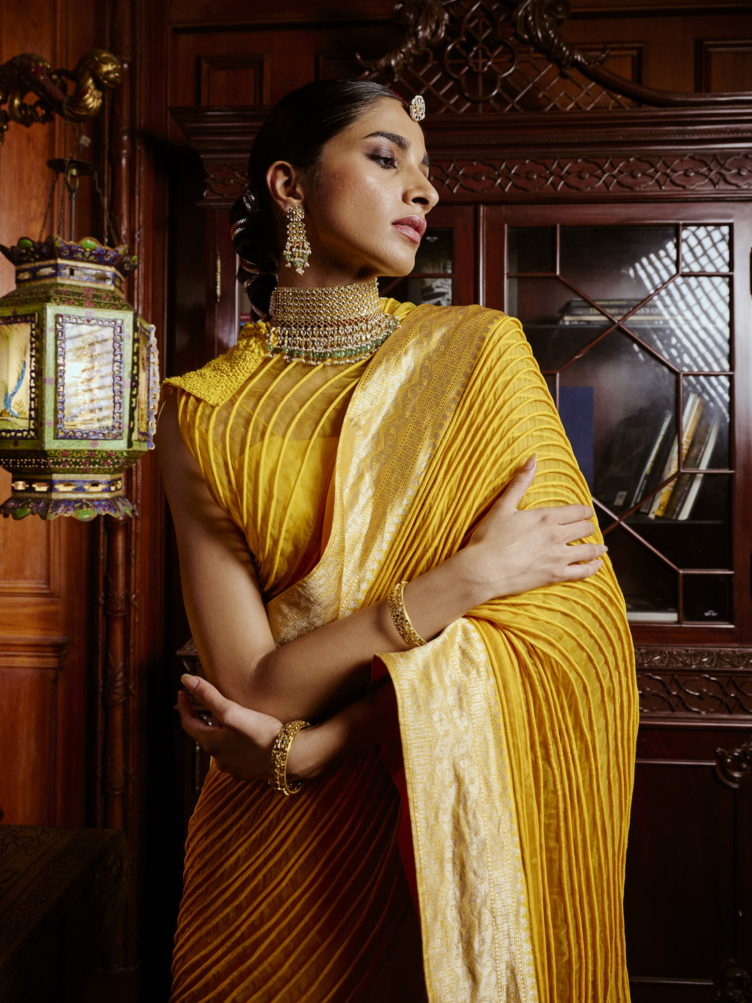 This timeless saree is meticulously handwoven by skilled Indian weavers and adorned with the brand’s signature cording technique. The result is a masterpiece of traditional craftsmanship and elegant design.