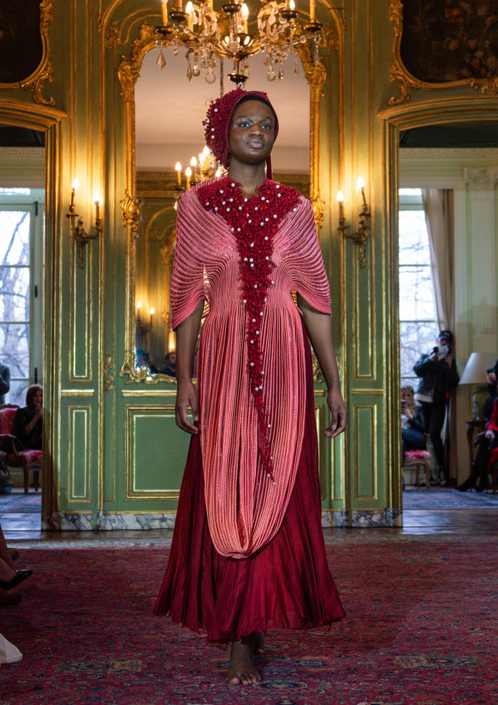 Embroidered Infinity Cape—a stunning creation inspired by the ethereal beauty of aquatic plants. This captivating cape seamlessly blends intricate cording details with delicate embroidery, resulting in a wearable masterpiece that evokes the mesmerizing essence of the underwater world.