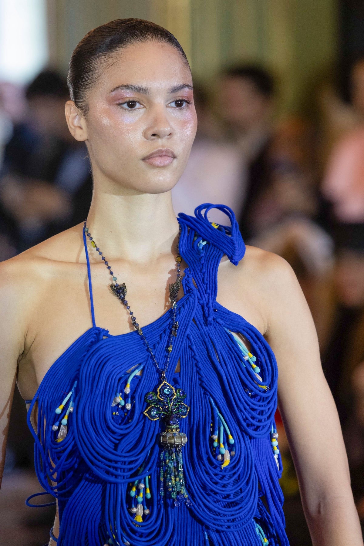 Peacock Parade Gown—an extraordinary masterpiece that pays homage to the majestic allure of peacocks. This gown is a celebration of elegance, featuring elaborate cording details inspired by the iridescent feathers and regal beauty of these magnificent birds.