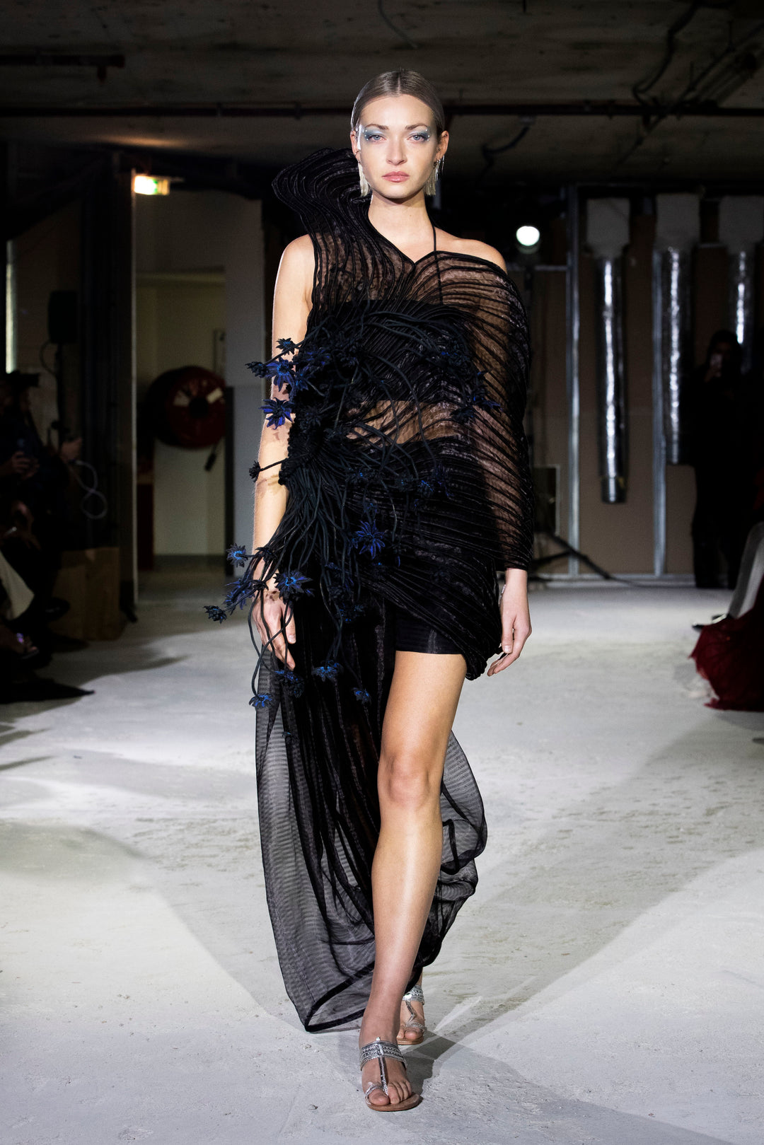 As a spin on our classic corded cape, the black Abyss dress features a shoulder drape along one side, and a sleeve drape along the other. The skirt has an asymmetric loose panel on one side. The intrigue of the dress is in its cobalt blue floral 3-D embellishments towards the right side of the dress! While the inner we provide with this is a bralette-and-shorts set, we can give you a midi-skirt to make the piece more formal, which you can contact our team for more details about. We're always open to colour customisations, so let us know if you have any requirements!