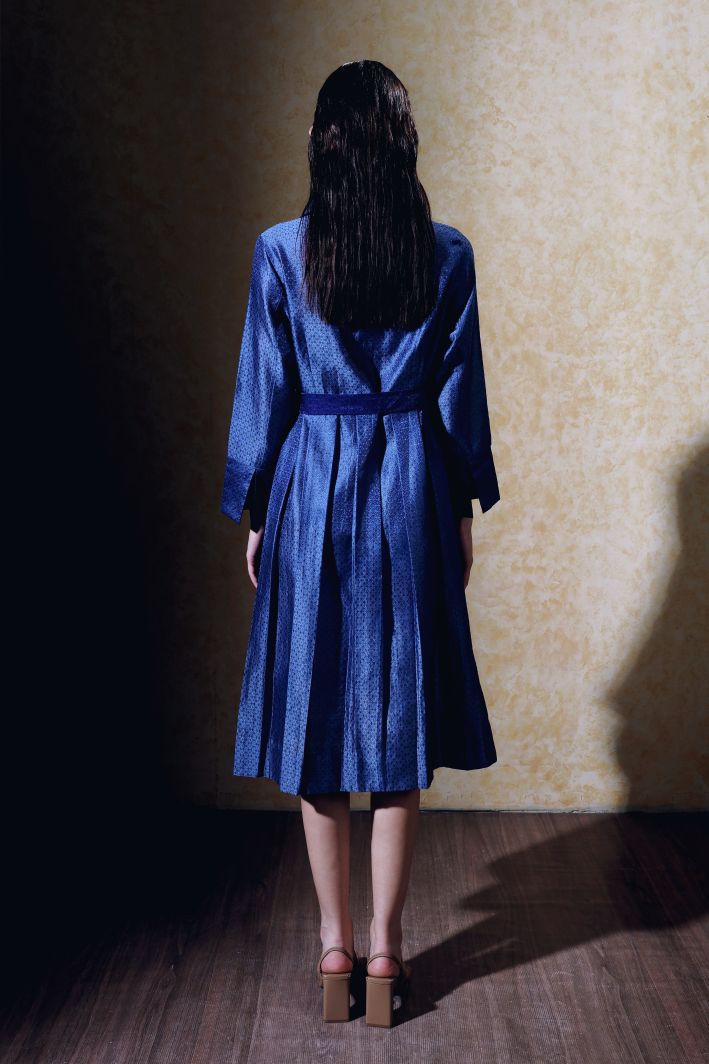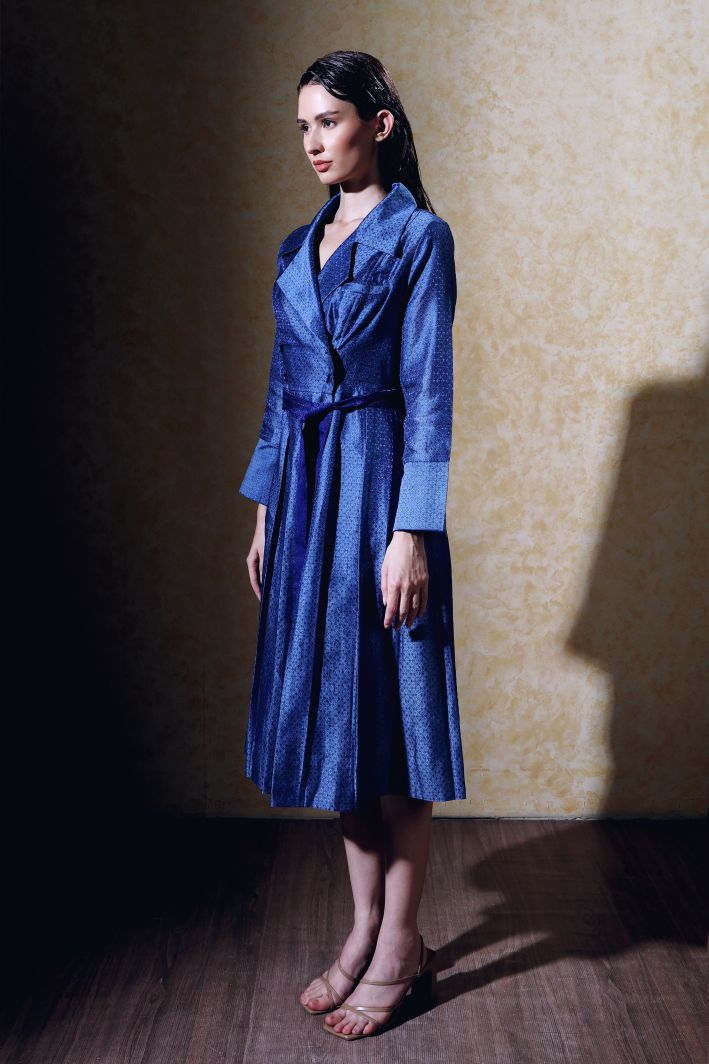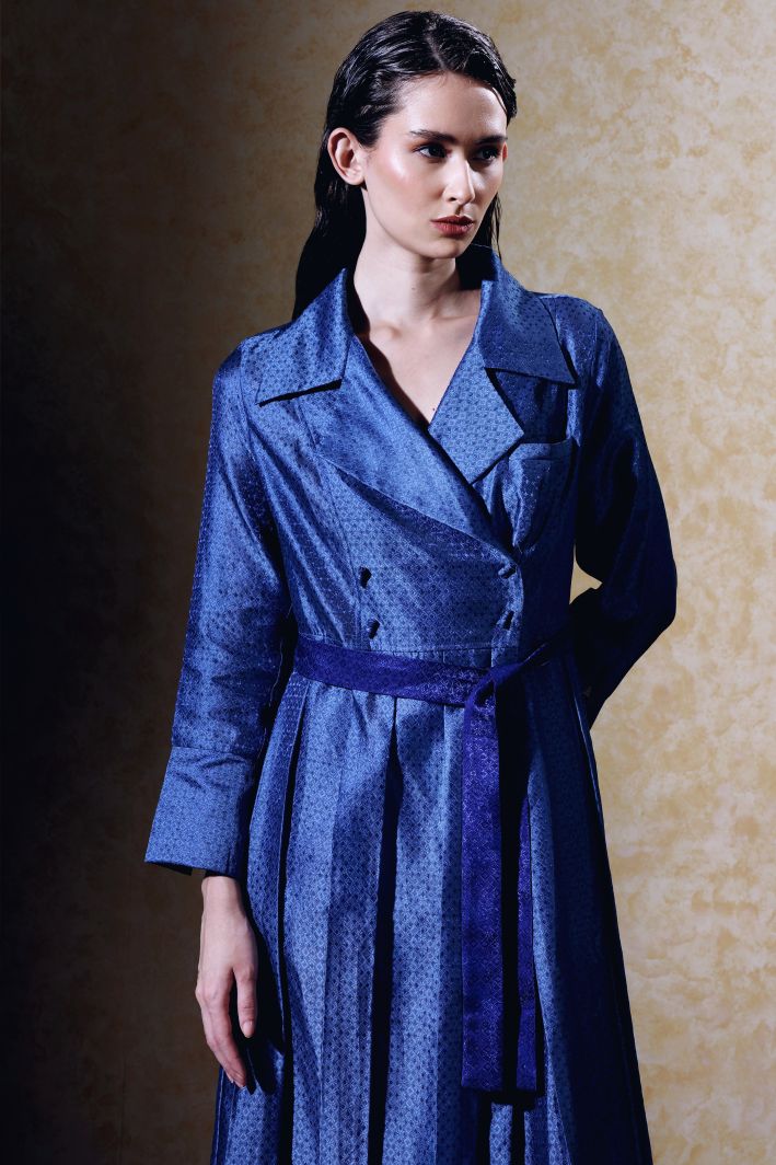 Crafted in rich Khunn, the dress features classic jacket detailing with a clean lapel and a belted waist that enhances the silhouette. Thoughtfully tailored, it offers both structure and fluidity for effortless movement.