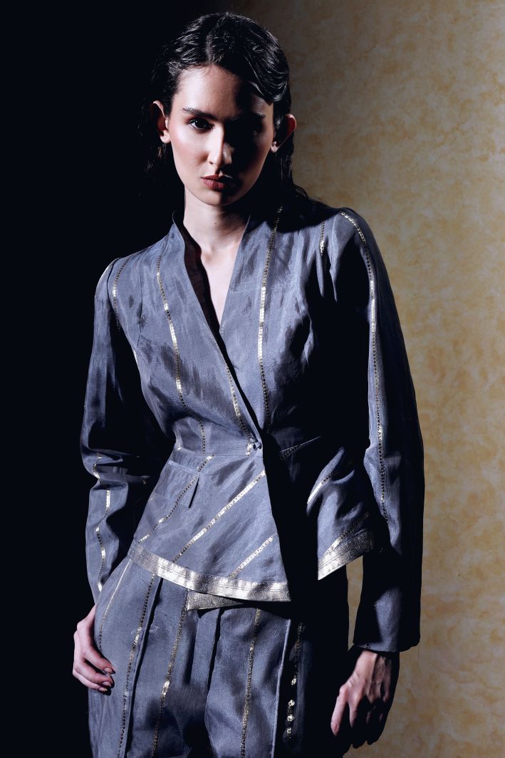 Balanced and versatile, the Aureum Set transitions seamlessly from day to evening. A contemporary classic that celebrates traditional fabric through clean lines and precise tailoring.