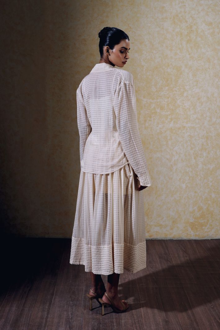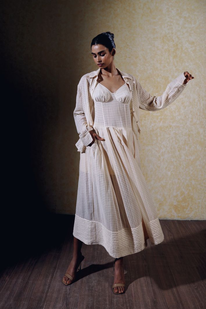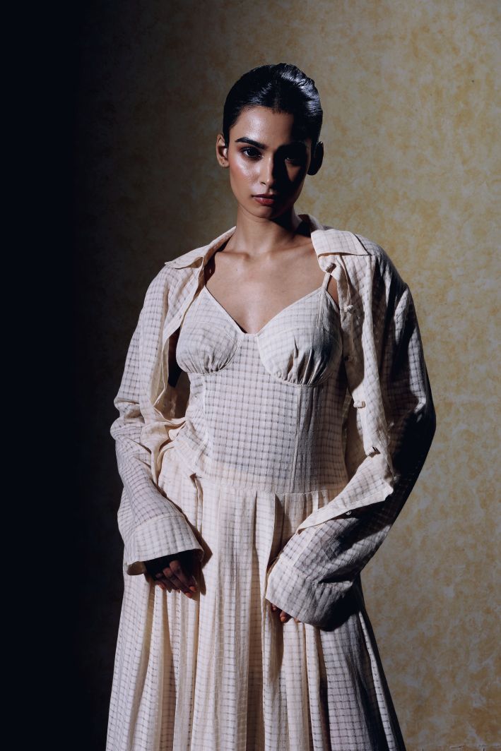 Layered over the dress, the Eden shirt creates a modern, structured look that elevates the overall ensemble in khadi. Together, this set balances contemporary tailoring with timeless craftsmanship, making it ideal for both formal and semi-formal occasions.