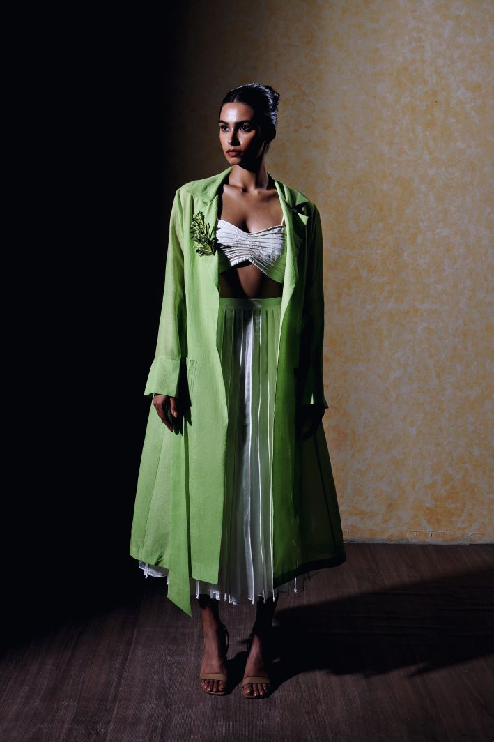 The jacket features delicate mushroom embroidery , the jacket adds structure and refinement, while the corded bustier and corded skirt bring depth and dimension through intricate cording. Together, the elements create a balanced silhouette that feels both contemporary and timeless.