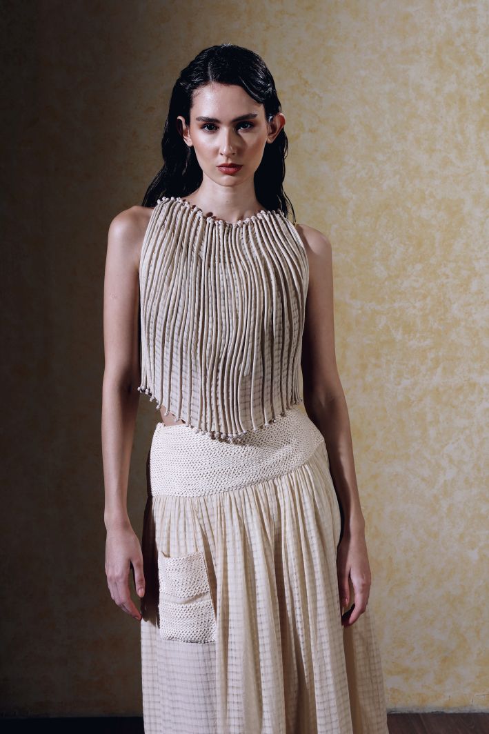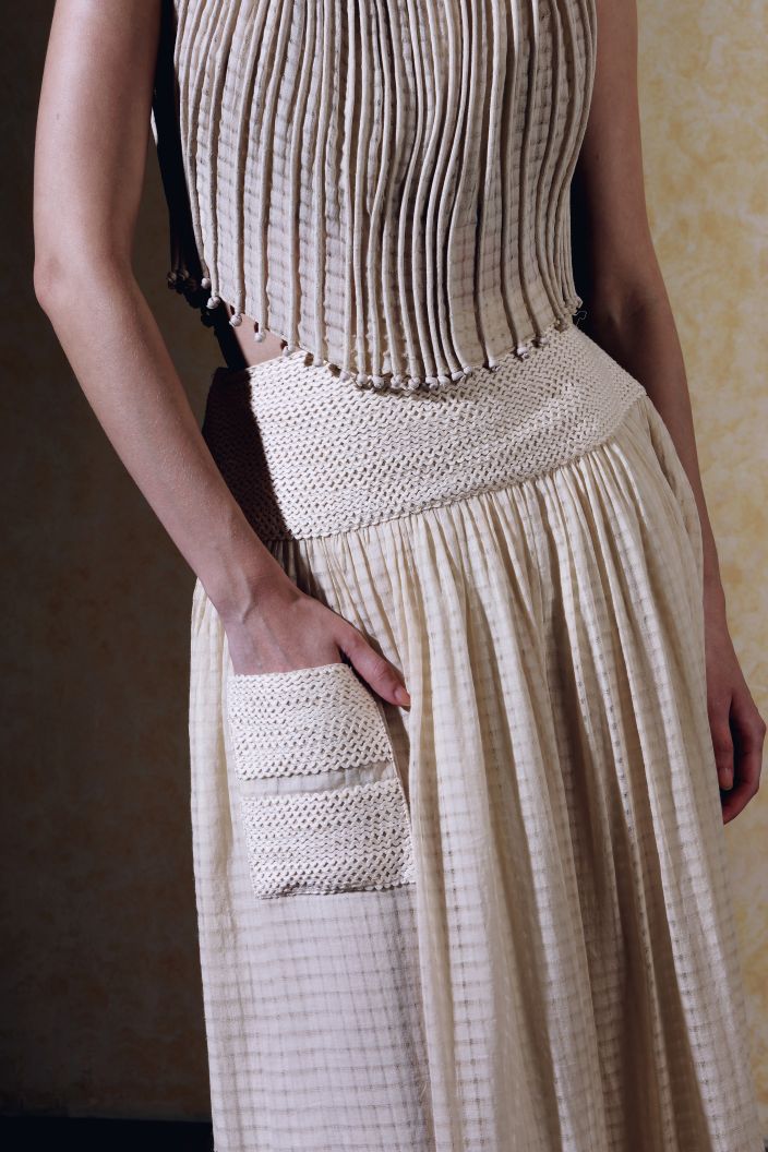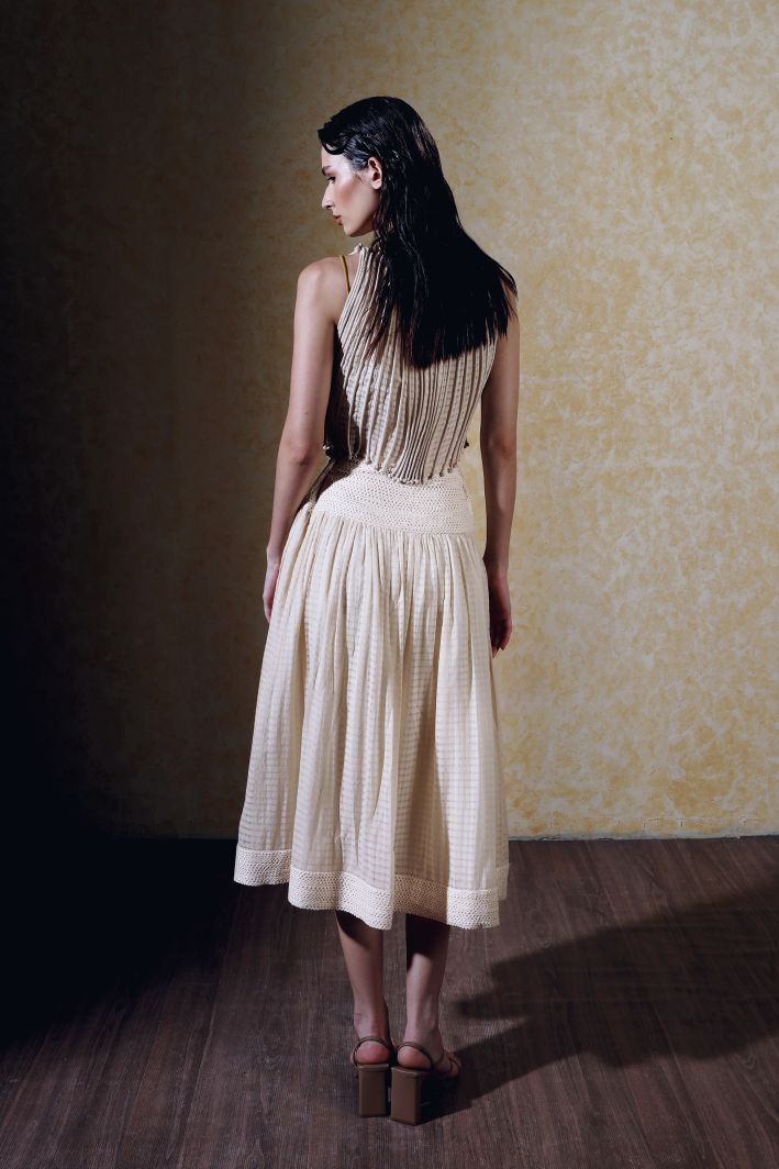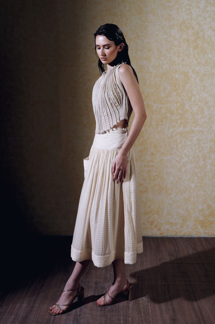 The Ripple Top and Serene Skirt Set embodies contemporary elegance rooted in craftsmanship. The sleeveless Ripple Top is meticulously crafted from the finest khadi, elevated with sculptural corded detailing made entirely from cotton, lending the piece depth, texture, and a distinctive structural character.